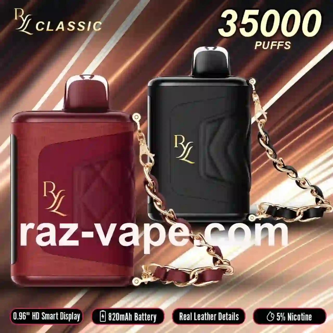 - RAZ RYL Classic 35000: The design here is sleek and elegant— think premium leather grips and a stylish chain strap. It’s made for the fashion-forward vaper who wants their device to look as good as it feels. 🖤✨ If you’re all about style, this one’s for you. 💼